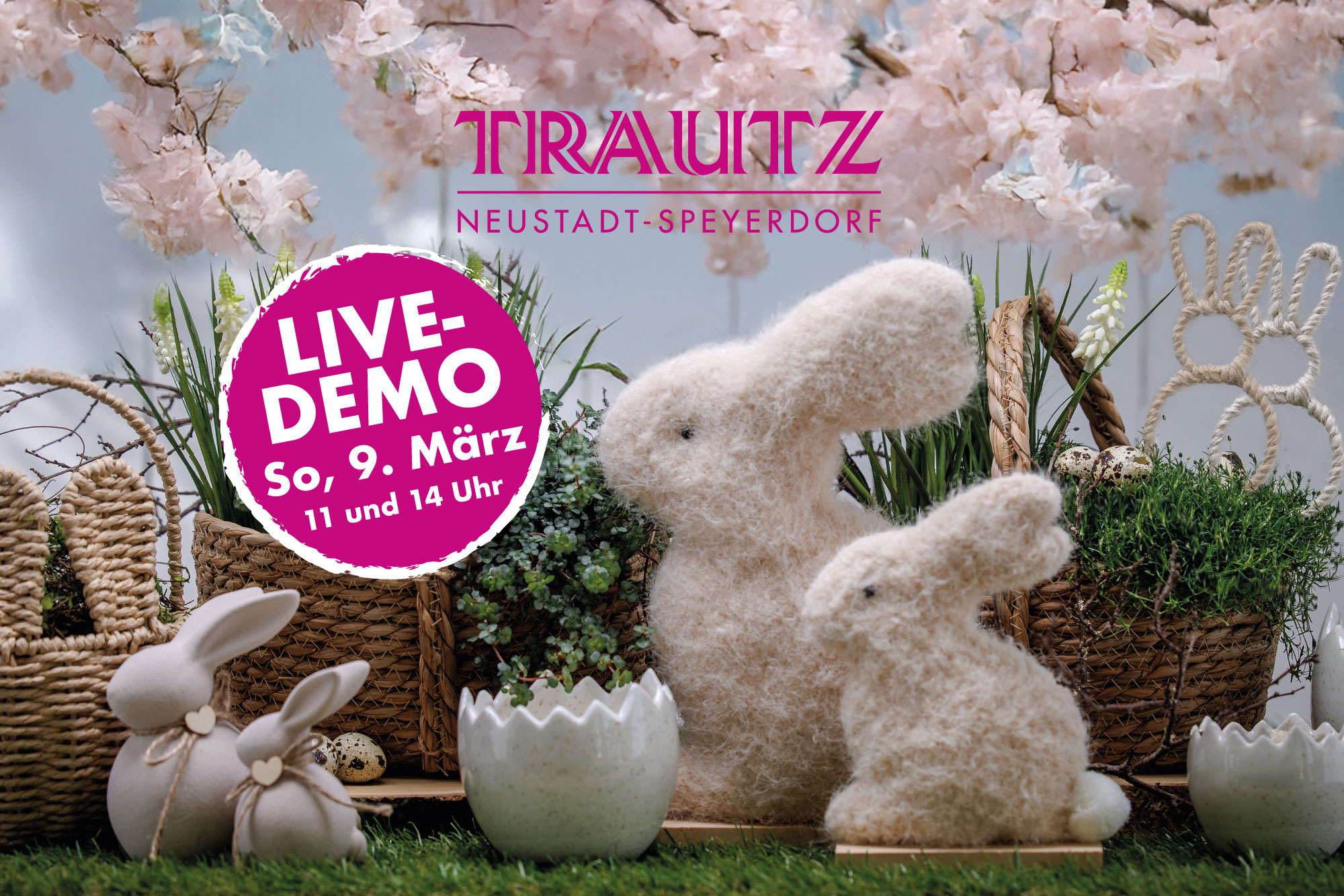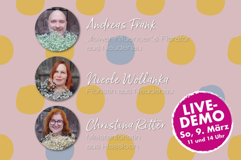 Flower-Influencer Andreas Frank und seine befreundeten Kolleginnen Nicole Wollanka und Christina Ritter, alle drei aus unserer Region, präsentieren praxisorientierte Floristik für die Frühlingszeit und Ostern. Bei den Live-Demos um 11 und 14 Uhr werden schnell umsetzbare Lösungen und kreative Praxistipps für gut verkäufliche Werkstücke gezeigt.